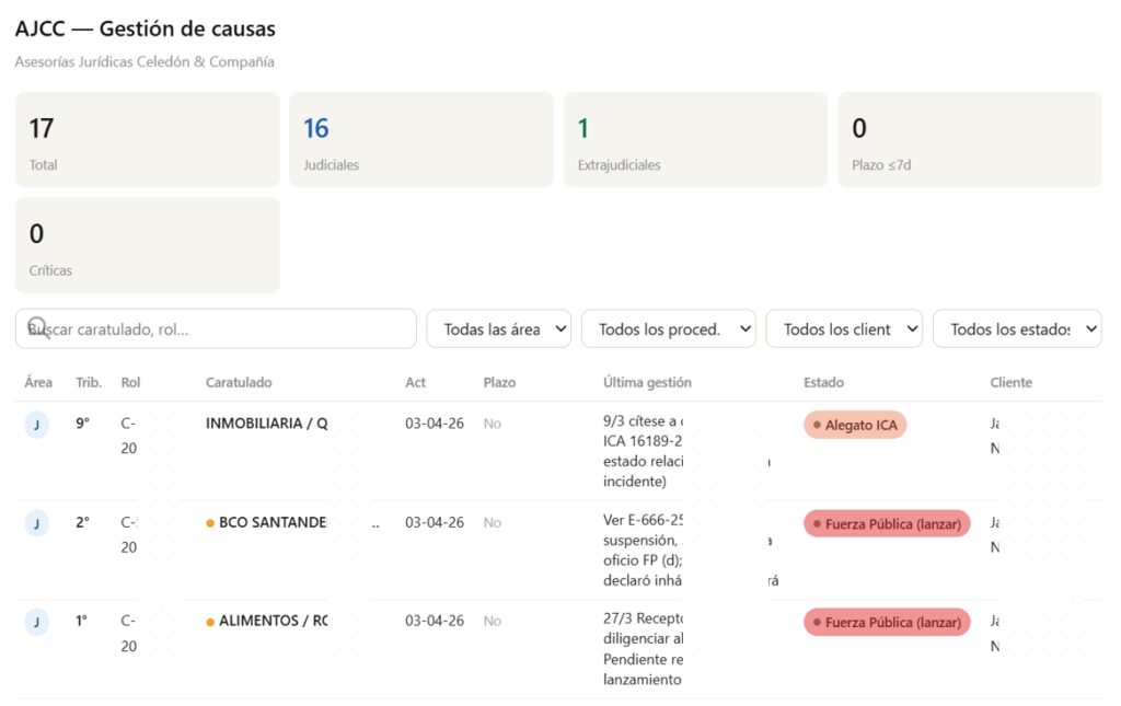 - Resumen cuantitativo: número total de causas, distinción entre gestiones judiciales y extrajudiciales, y alertas relevantes.